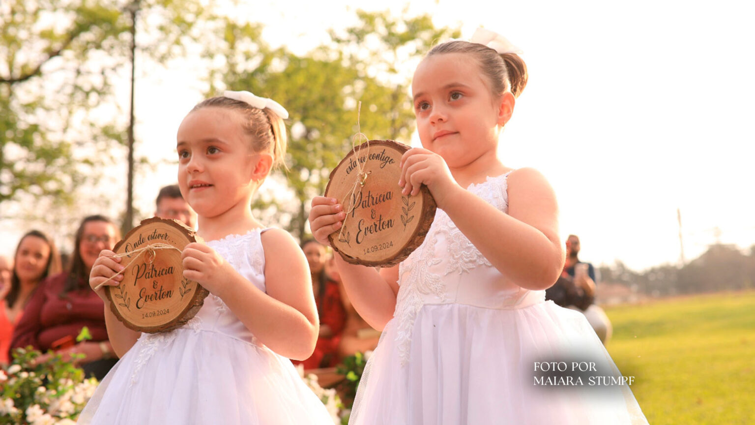 Mas, isso não é uma regra! Em alguns casos, as daminhas acompanham o pajem, que pode ser o responsável por levar as alianças, criando um momento ainda mais fofo e memorável. No fim, tudo depende da escolha do casal, que pode optar por incluir apenas o pajem, apenas as daminhas nessa função, ou os dois.